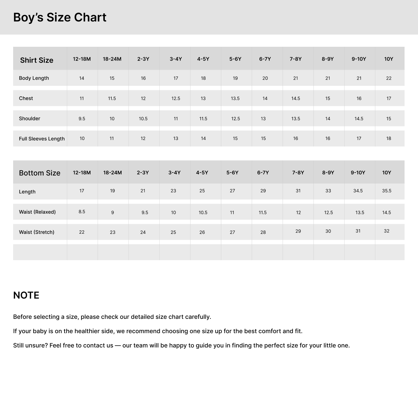 Still unsure? Feel free to contact us — our team will be happy to guide you in finding the perfect size for your little one.